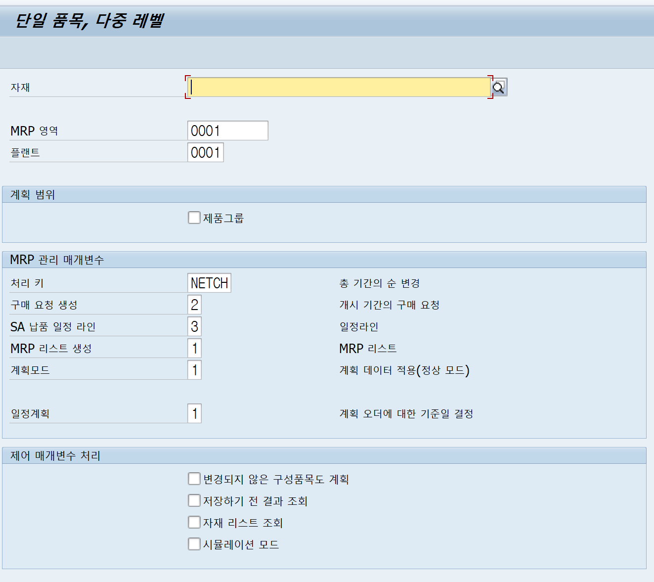 MD01 은 계획범위, 공장 하위에 해당하는 모든 자재에 대한 소요량을 계산한다.